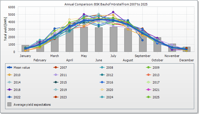 The expected average yield results from a manual specification. Depending on the orientation and the irradiation fluctuations between the individual years, there might be considerably larger deviations in contrast to the expected average yield.