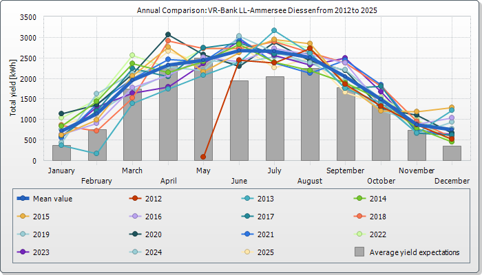 The expected average yield results from a manual specification. Depending on the orientation and the irradiation fluctuations between the individual years, there might be considerably larger deviations in contrast to the expected average yield.
