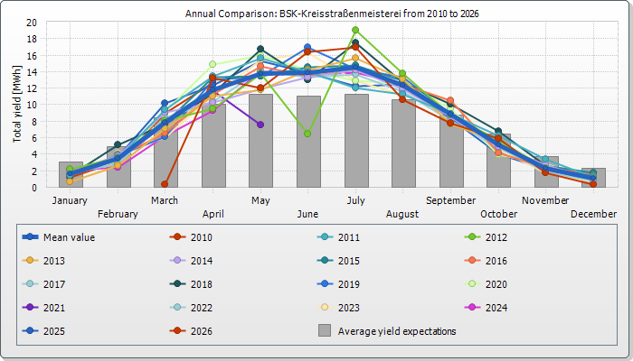 The expected average yield results from a manual specification. Depending on the orientation and the irradiation fluctuations between the individual years, there might be considerably larger deviations in contrast to the expected average yield.