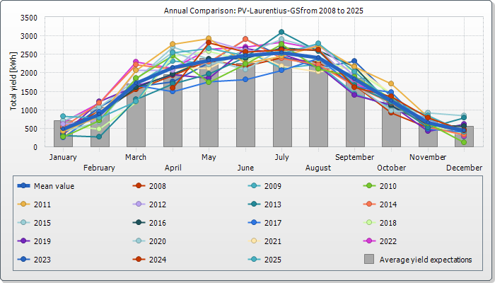 The expected average yield results from a manual specification. Depending on the orientation and the irradiation fluctuations between the individual years, there might be considerably larger deviations in contrast to the expected average yield.