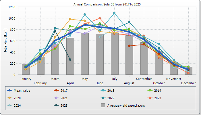 The expected average yield results from a manual specification. Depending on the orientation and the irradiation fluctuations between the individual years, there might be considerably larger deviations in contrast to the expected average yield.