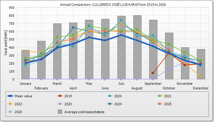 The expected average yield results from a manual specification. Depending on the orientation and the irradiation fluctuations between the individual years, there might be considerably larger deviations in contrast to the expected average yield.