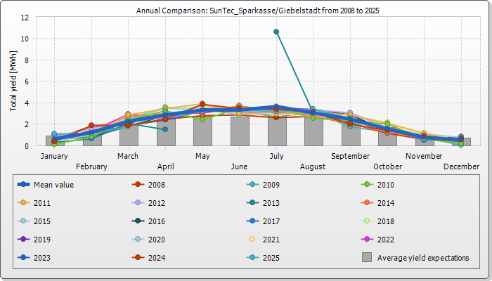 The expected average yield results from a manual specification. Depending on the orientation and the irradiation fluctuations between the individual years, there might be considerably larger deviations in contrast to the expected average yield.