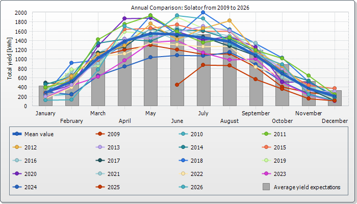 The expected average yield results from a manual specification. Depending on the orientation and the irradiation fluctuations between the individual years, there might be considerably larger deviations in contrast to the expected average yield.