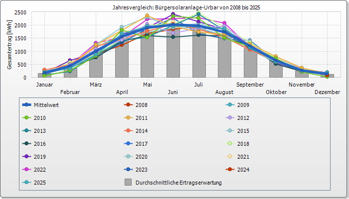 Die durchschnittliche Ertragserwartung resultiert aus einer manuellen Vorgabe. In Abhängigkeit der Ausrichtung und den Einstrahlungsschwankungen zwischen den einzelnen Jahren kann es durchaus zu größeren Abweichungen zur durchschnittlichen Ertragserwartung kommen.
